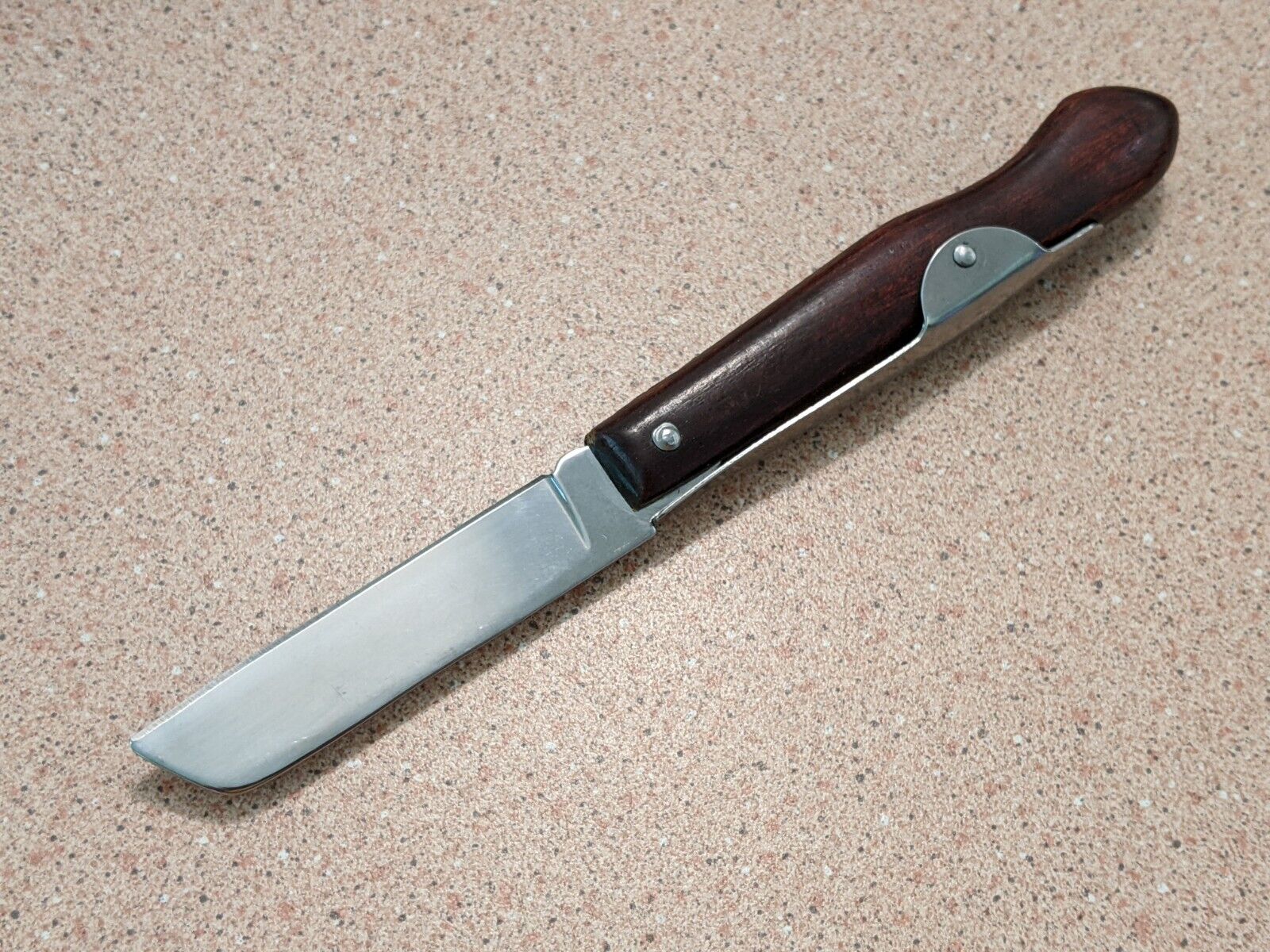 This knife is a unique but simple design that has been around for hundreds of years. The blades are 1055 high carbon steel, tempered for easy sharpening and good edge retention (about an HRC of 54). The flat spring mounted to the surface of the knife is a style that goes back many hundreds of years and works really well. The blade of the lockback locks solidly and is released by pulling up on the ring.
